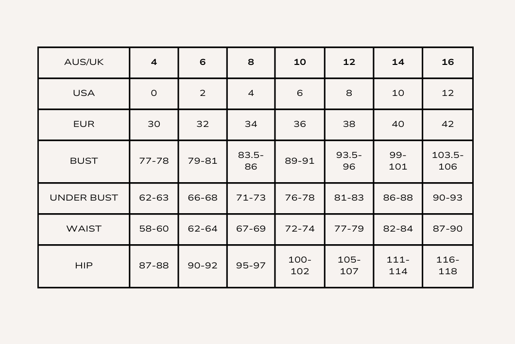 Please take note that although the sizing guide will help you find your closest fit for you. It is most likely that some minor alterations may need to be done. This is due to everyone's unique body and shape.
